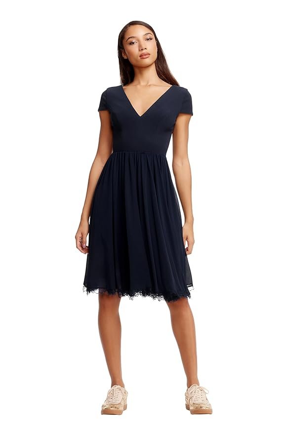 - Style: Corey Plunging Mix Media Cap Sleeve A-line Midi Dress